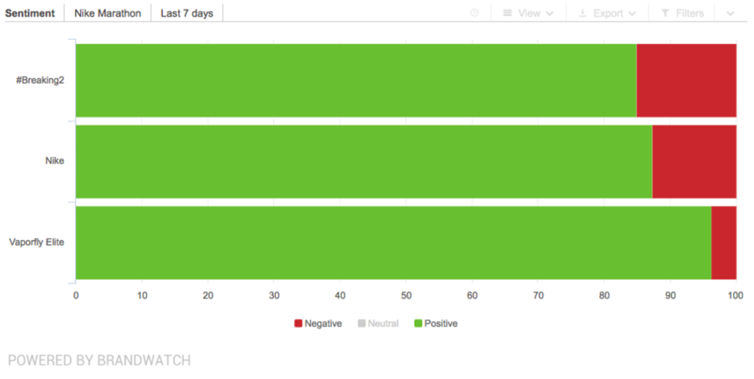 在2016年底宣布这一计划后,「破2」为耐克带来了巨大的话题度。美国数字媒体DIGIDAY曾援引监测和分析机构Brandwatch高级数据分析师Kellan Terry的话,仅在2017年挑战结束后,一周内 的曝光量超过2万亿次,是他见过的特定标签曝光量最高的一次。